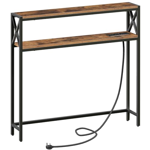 YATINEY Console Table, Slim Behind Sofa Table with Charging Station, Skinny Entryway Table,Metal Frame, for Living Room, Entryway, Hallway, Rustic Brown and Black XCT05KBR