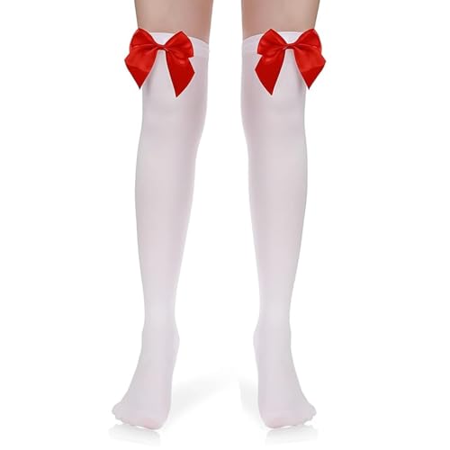 1 Pair White Stockings for Women,Thigh High Socks Over Knee Red Bow Long Christmas Black Highs Sock Halloween Womens Sexy Socks Accessories Stocking Cozy Valentine's Adult Lace Silk Opaque,for Gifts