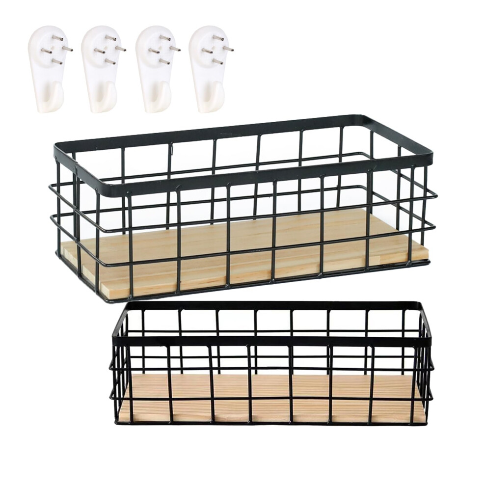 2 Pack Black Metal Wire Storage Baskets with Wood Bottoms, Wall Mounted Bathroom and Kitchen Organizer