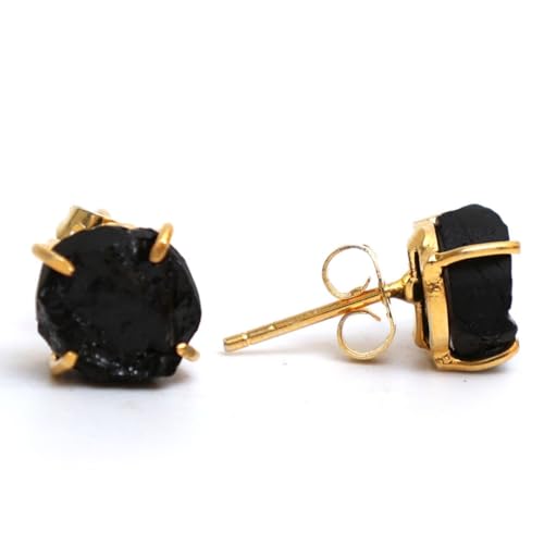 Gempires Gift Natural Raw Black Tourmaline Crystal Stud Earrings For Women Simple Dainty Jewelry Gemstone Handmade Gold Plated Hypoallergenic Post Earrings Minimalist Everyday Wear