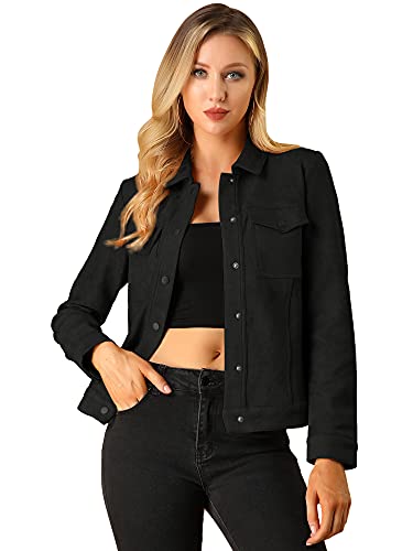 Allegra K Women's Turn-Down Collar Flap Pockets Snap Button Faux Suede Jacket, Black, M