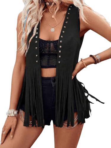 Kouoybt Women Tassel Vest 70s Hippie Sleeveless Rivet Faux Suede Vest Western Fringe Waistcoat Open Front Jacket Cardigan (A-Black, L)