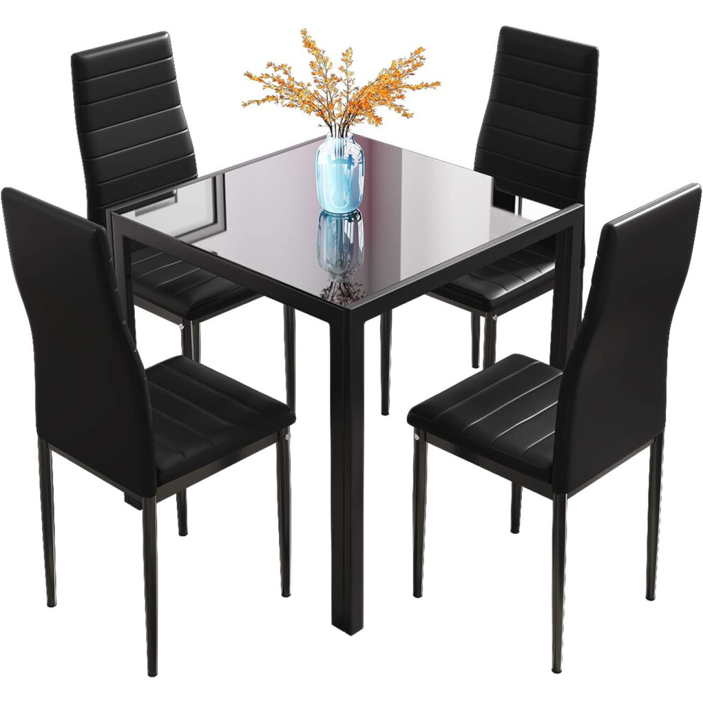 (Black) Glass Table and Chairs Set 4, 75cm Square Table with 4 Faux Leather High Back Chairs Modern Dining Room Sets for Home Kitchen Office