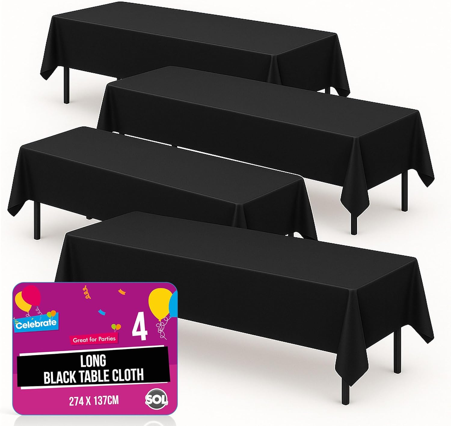 SOL 4pk Long Black Table Cloth Party 274x137cm Plastic Cover Tablecloth Disposable for Parties - Heavy Duty Spill Protection - Opaque Rectangular Design - Multipurpose for Weddings, Catering & Buffets