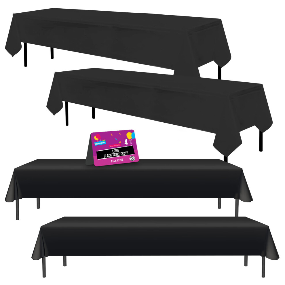 4pk Long Black Table Cloth Party | 274 x 137cm Plastic Table Cover