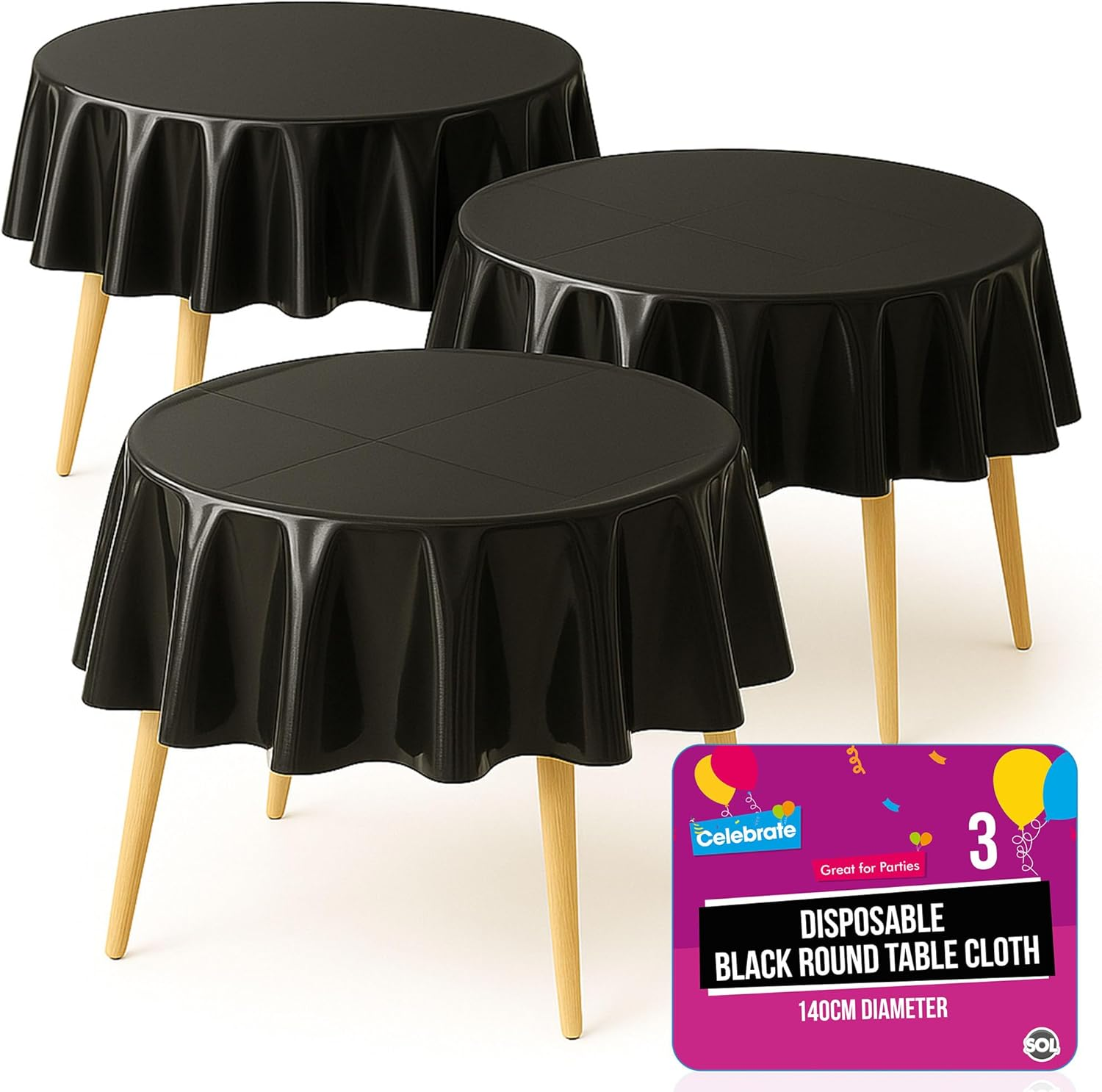 3Pk Black round Table Cloth Disposable 140Cm Party Tablecloths for Circular Tabl