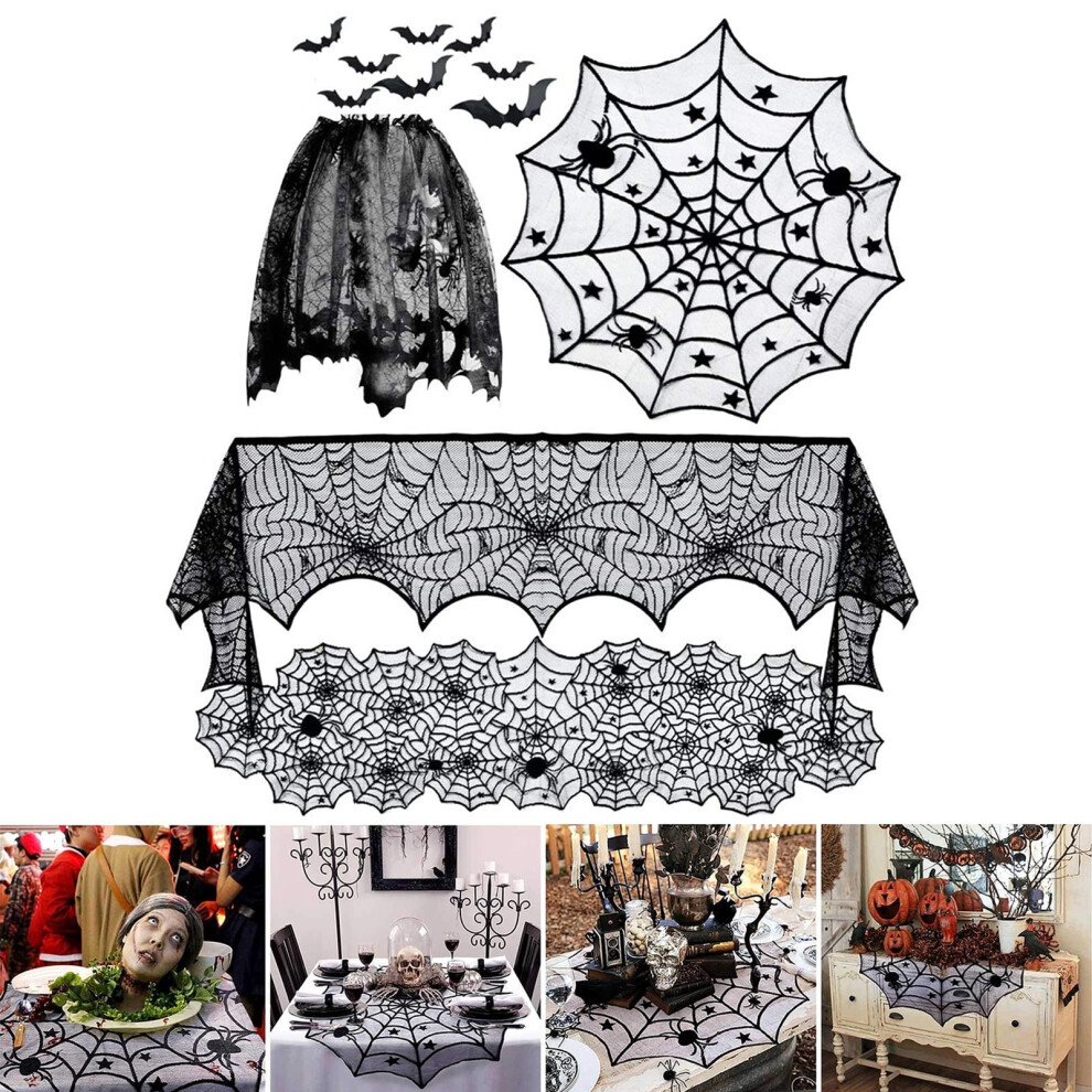Halloween Tablecloth Set - Spider Web, Black Lace Table Cloth, Runner & Fireplace Cloth for Home Decor