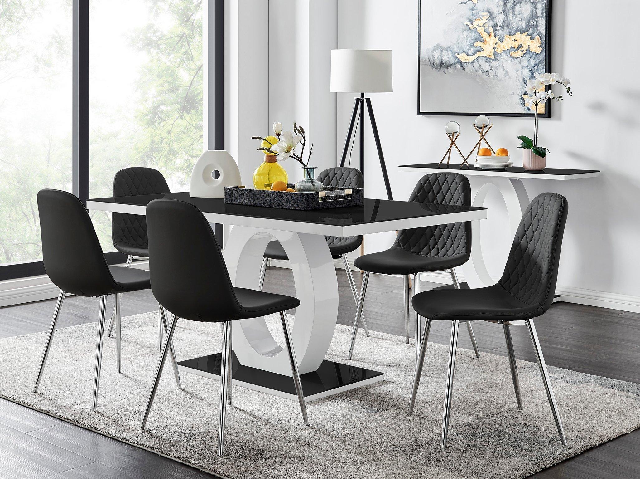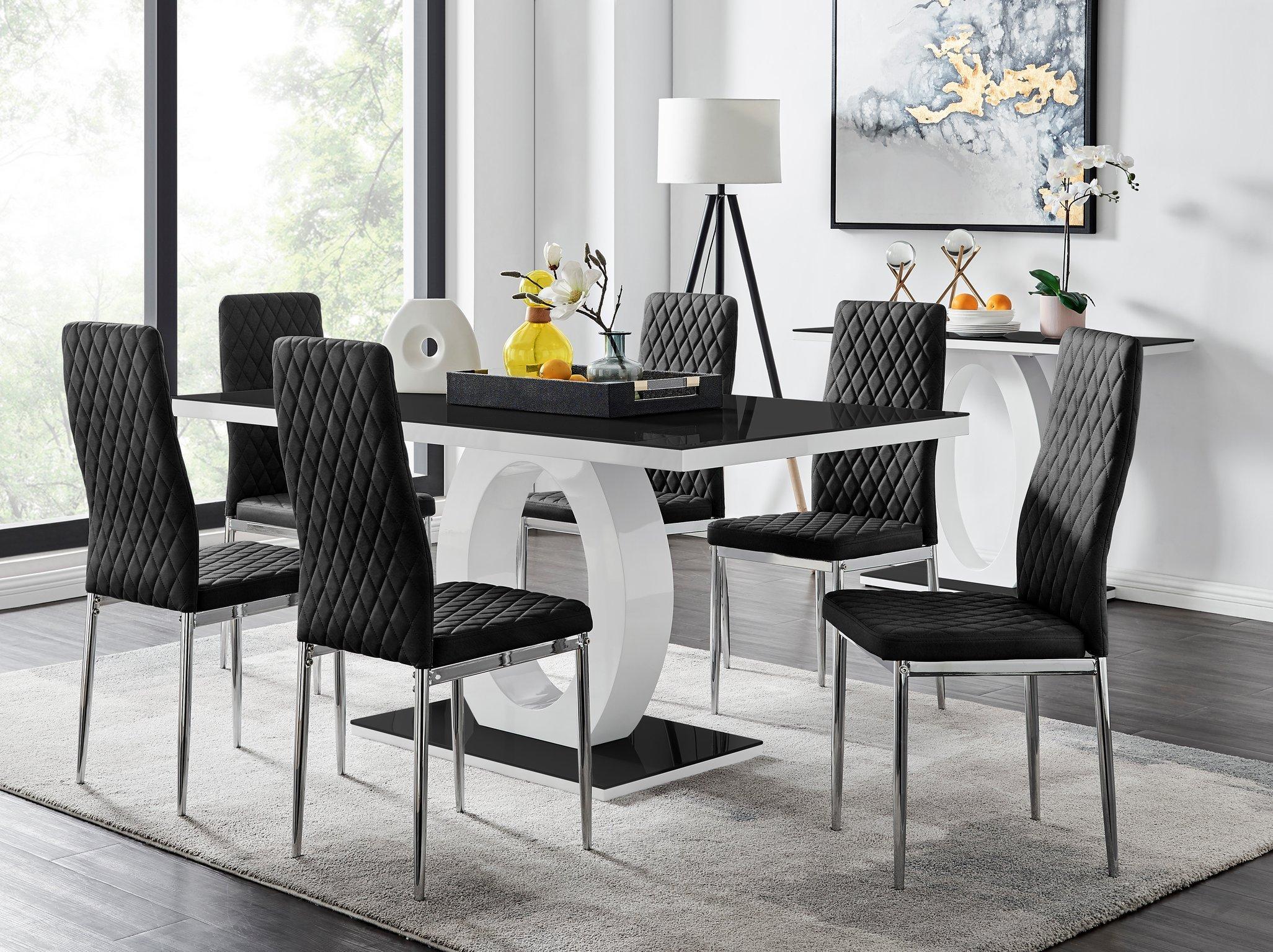 Giovani Rectangular 6 Seat White High Gloss Unique Halo Dining Table Black Glass Top 6 Faux Leather Silver Leg Milan Chairs