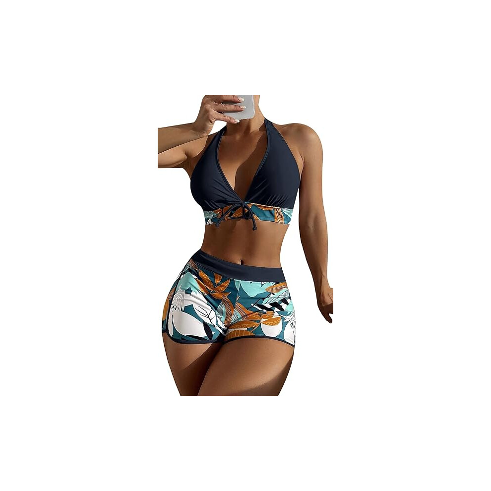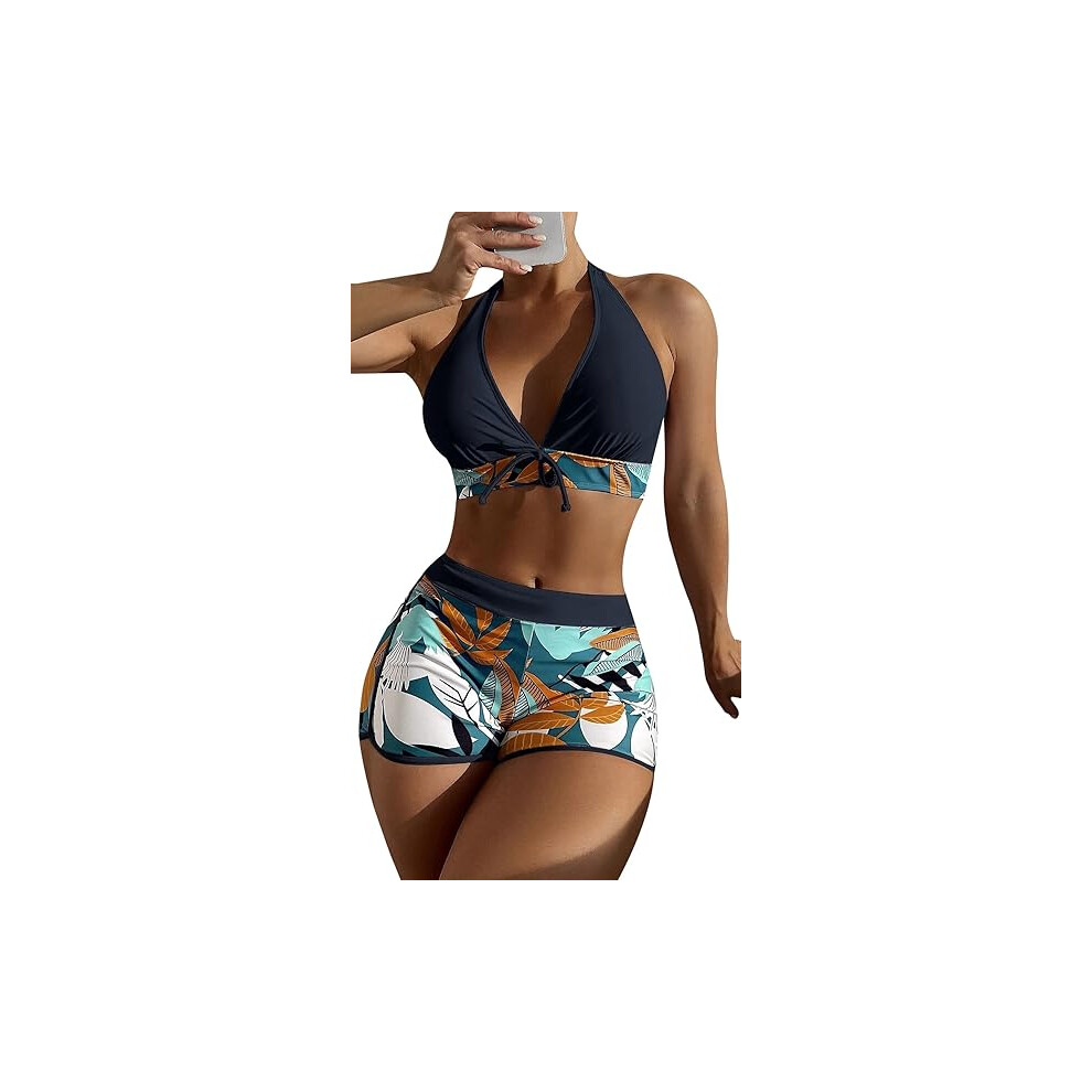 (S, Black) Women's Tankini Sets Sexy Two Pieces Swimsuit Halter Neck Top with Shorts Bikini Sets Floral Print Swimwear Plus Size Push Up