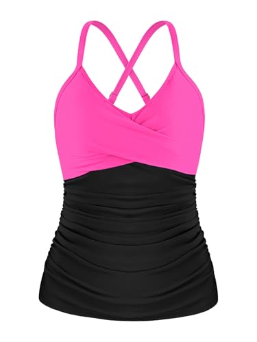 Ocean Blues Women's Hot Pink & Black Tummy Control Tankini Swimuit Top Push Up V-Neck Tankini Top Only Size X-Large