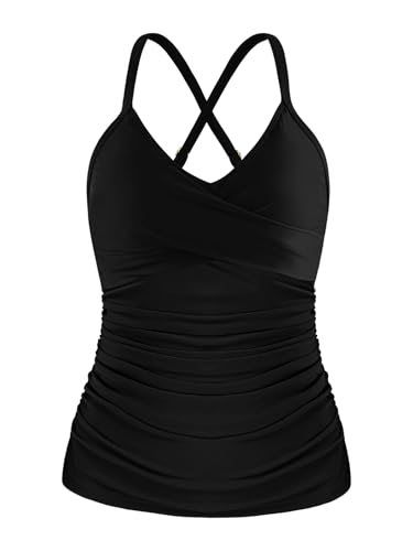Aqua Eve Women's Black Large Tankini Top Only, Tummy Control, Quick-Dry, Solid, Scoop Neck, Adjustable Strap, Sleeveless, Mid Rise, Lightweight, Medium Stretch, Size L