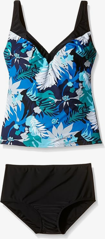 Flower Top And Black Bottom XXL Tankini Swimsuit V Neck Spaghetti Strap Digi NEW