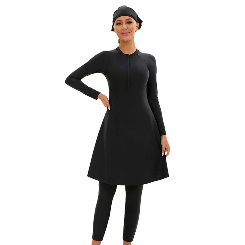 Women's Long Sleeve 3-Piece Swim Set with Skirt, Full Coverage Tankini, Black, L â Compatible with Beach Relaxation