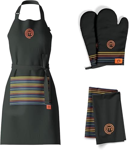 MasterChef Set of 3 Tea Towels, Kitchen Apron and Oven Gloves, Heat Resistant, Black, 100% Cotton with Hanging Loops, Machine Washable, Embroidered Details