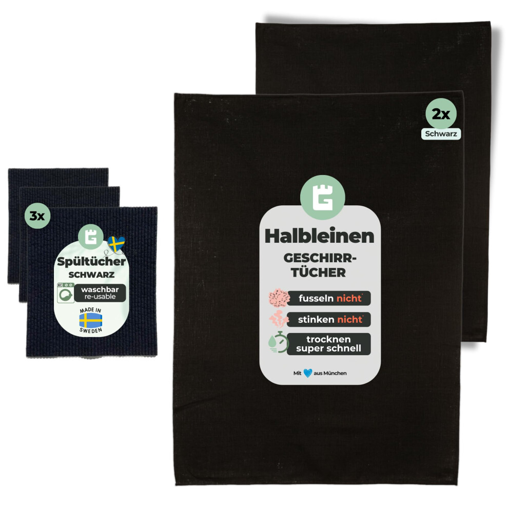 Gr?nschloss Tea Towels Half-Linen & Dish Cloths Black - Set of 2 Tea Towels 50 x 70 cm Large (Absorbent + No Smells) + 3 x Washable Dish Cloths -