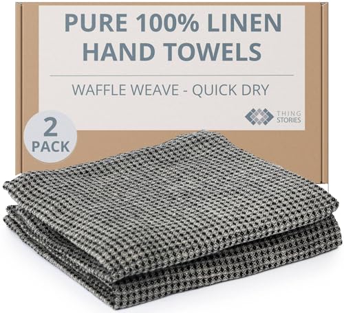 Thing Stories Pure 100% Linen Hand Towels - Set of 2 Linen Kitchen Towels Waffle Weave Black-Natural - 13 x 29-inch Soft Lightweight Stone-Washed Dish Towels - Quick-Dry Tea Towel - Kitchen Linens