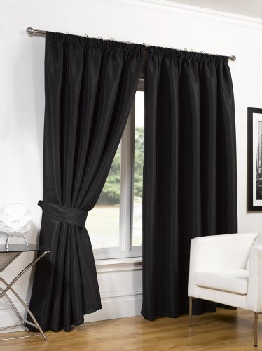 Dreamscene Luxury Faux Silk Blackout Thermal Soft Pencil Pleat Lined Curtains With Tiebacks - Black 46" x 72"