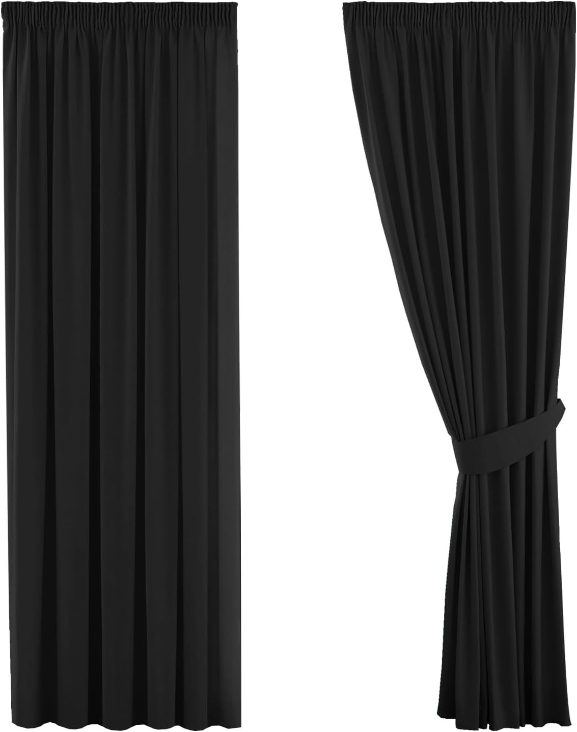 Imperial Rooms Blackout Pencil Pleat Curtains for Bedroom 66 x 84 Drop Inch Black Curtains Thermal Insulated Door Curtain, 1 Panel with 1 Tieback