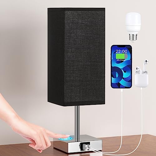 Aooshine Black Touch Lamp, Bed Lamp with USB-C+A Charging Ports, Black Metal Base(Bulb Included)