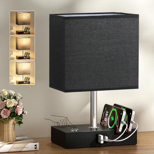 PreeOtti Black Bedside Lamp, Touch Lamp with USB Charging Station and Organizer(Bulb Included)