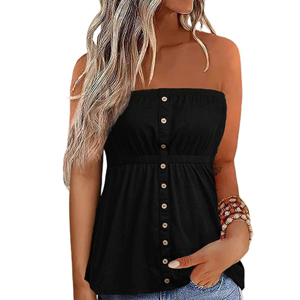 (Black XL) Strapless Tube Top Button Front Ruffle Hem Summer Blouse OD Green M