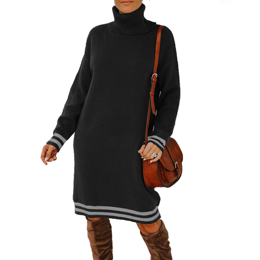 (Black L) Turtleneck Sweater Dress Black Knee Length Long Sleeve L