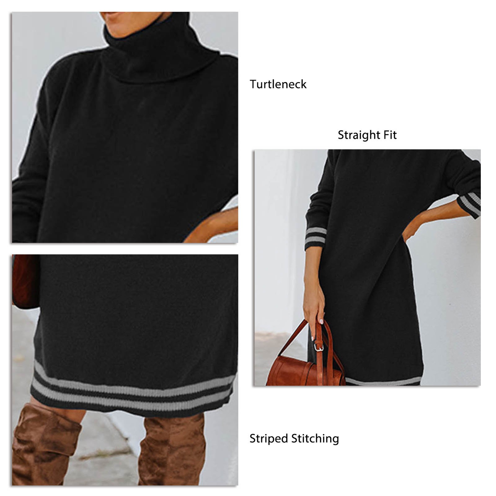 Black L Turtleneck Sweater Dress Straight Fit Knee Length Long Sleeve Loose
