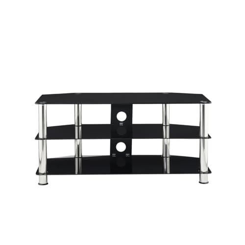 MMT Black Glass TV Stand with 3 Shelves and Cable Management, 140cm Side Table TV Stand Cabinet, Black Legs, Fits up to 65-Inch TVs