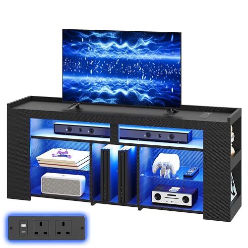 IRONCK 140CM LED TV Stand for 55/65 Inch TV, Carbon Fiber TV Unit with Power Outlet, Media Entertainment Center for PS4/Xbox, Wooden TV Console Table Storage Cabinet for Living Room Bedroom, Black