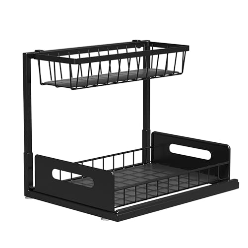 LMXRYPD 2-Tier Layer Under Sink Storage Rack, Premium Pull-Out Cabinet Organizer Shelf, Carbon Steel Storage Shelves, for Cabinets, Bathrooms, Laundry(Black)