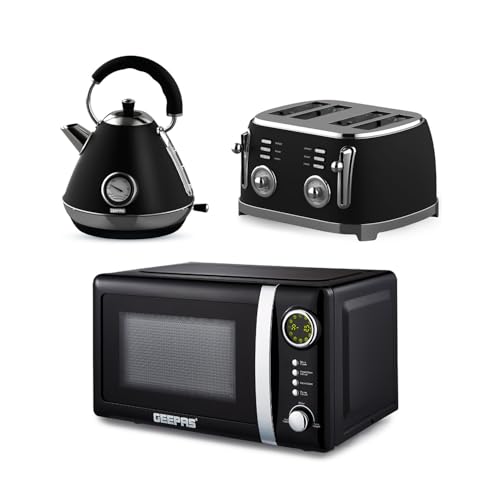 GEEPAS 1.8L Electric Kettle, 4 Slice Bread Toaster & 20 Litre 700W Digital Freestanding Microwave Oven Kitchen Combo Set | 3000W Vintage Cordless Kettle | Defrost/Reheat/Cancel 1500W | Black Retrovive
