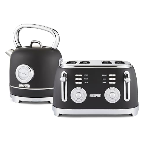GEEPAS 1.8L Electric Kettle & 4 Slice Bread Toaster Kitchen Combo Set | 3000W Vintage Cordless Stainless Steel Kettle Auto Shut-Off, Temperature Gauge | Defrost/Reheat/Cancel 1500W | Black Retrovive