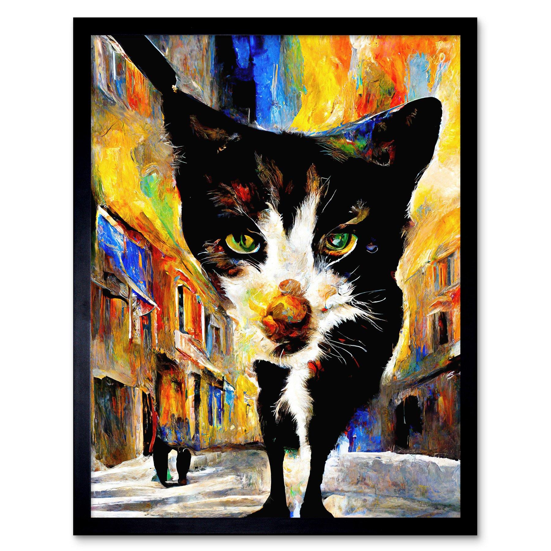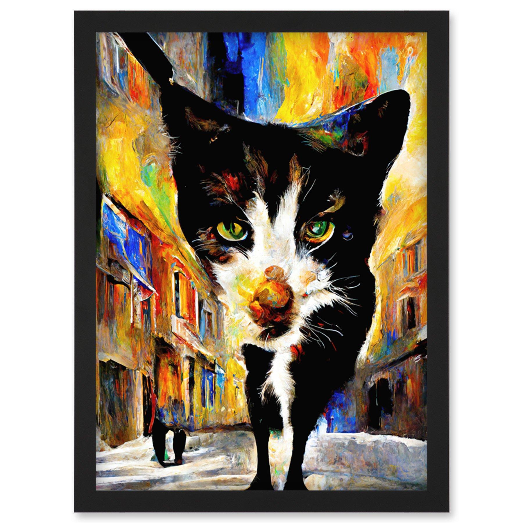 Black Street Cat Walking Bright Neighbourhood Night Artwork Framed Wall Art Print A4
