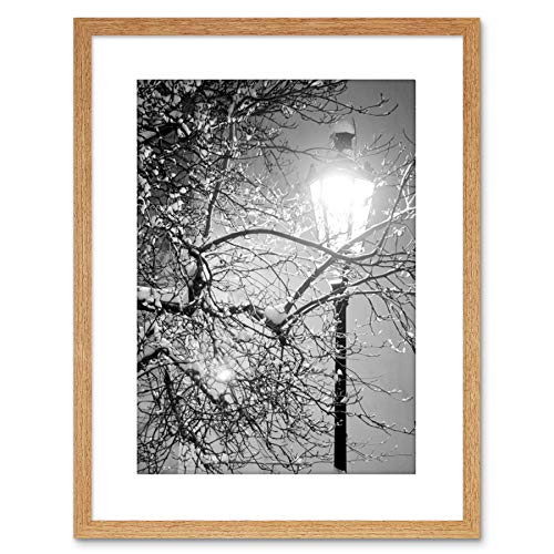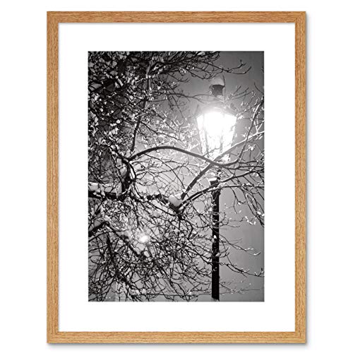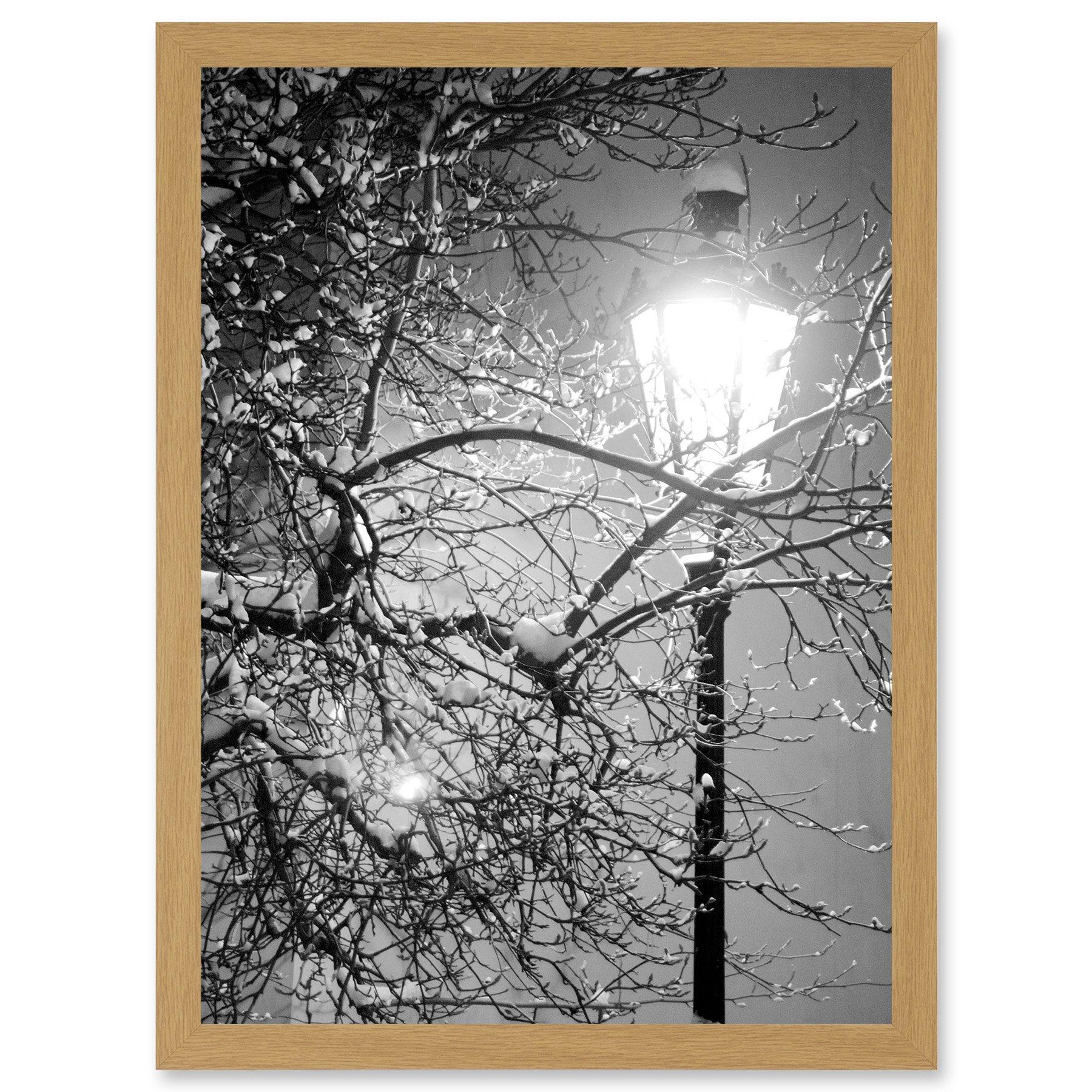 Street Lamp Paris France Winter Night Black White A4 Artwork Framed Wall Art Print