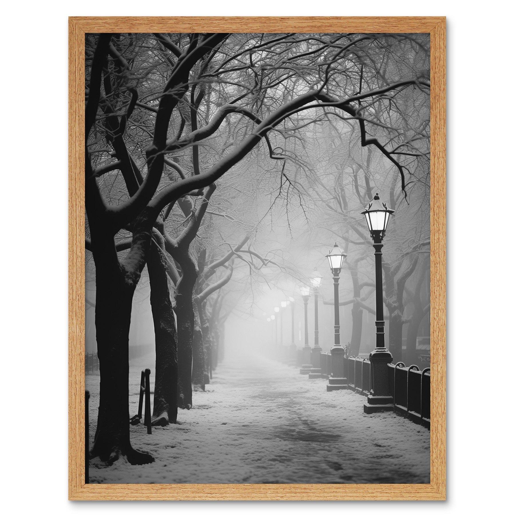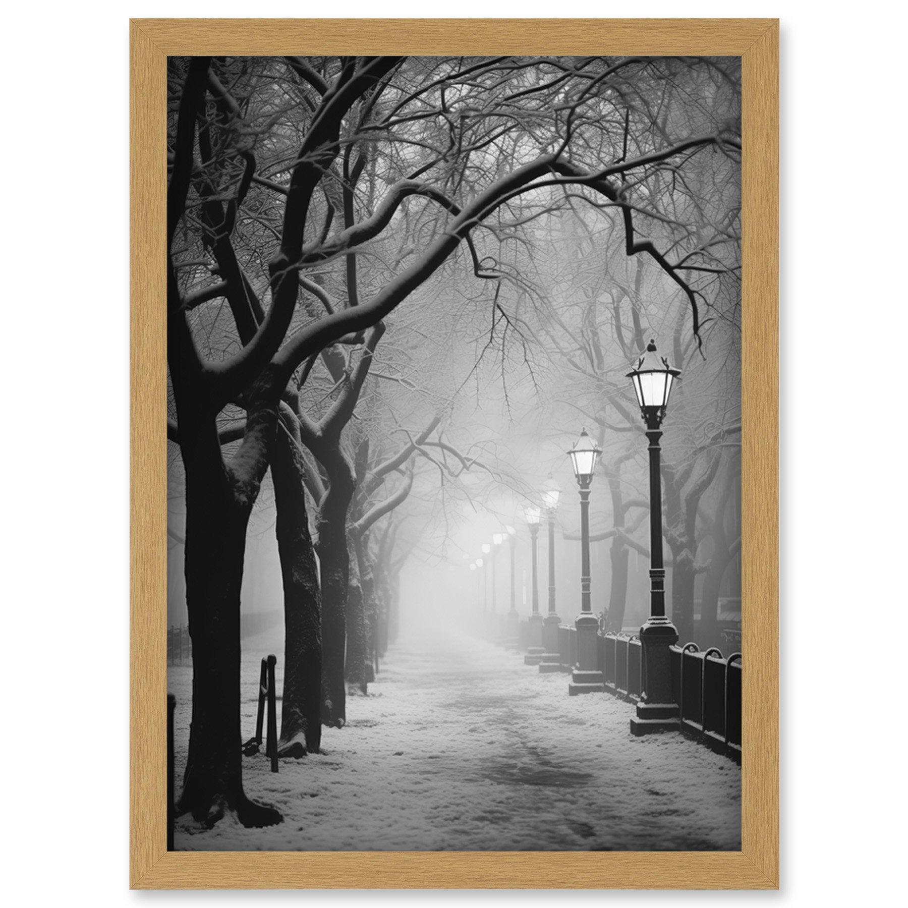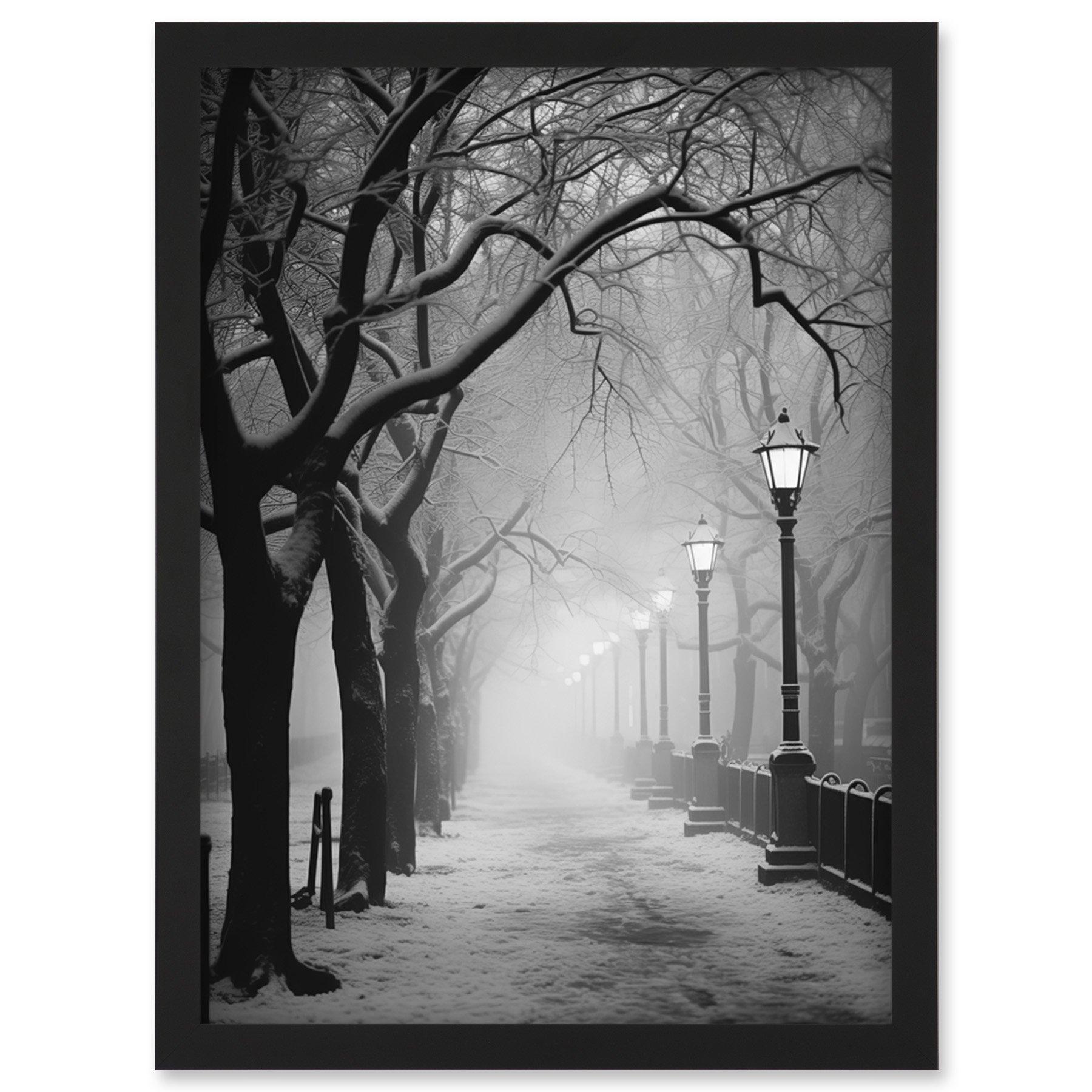 Snow Covered Street in the Misty Glow of Light Posts Atmospheric Black and White Photograph Winter Scene Artwork Framed Wall Art Print A4