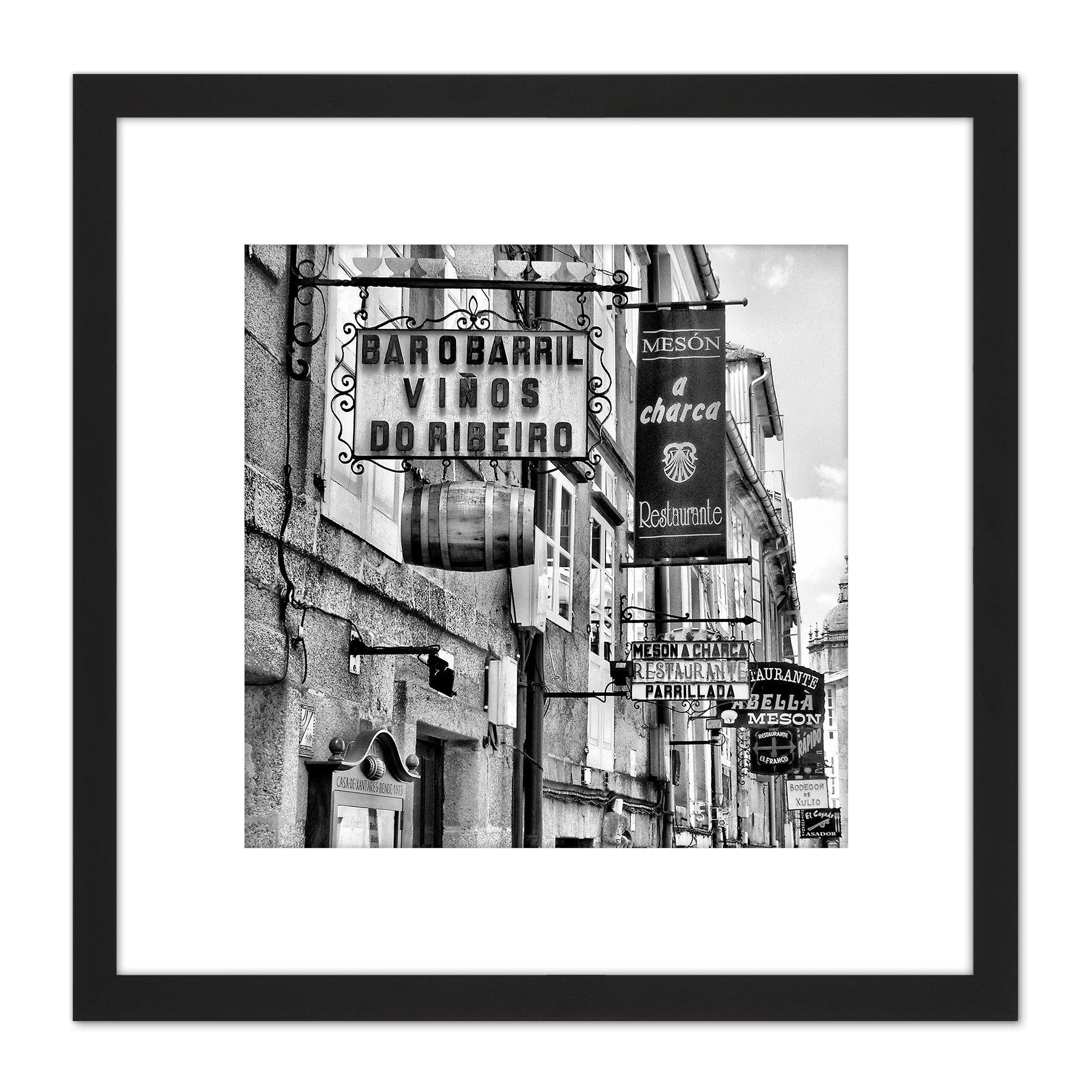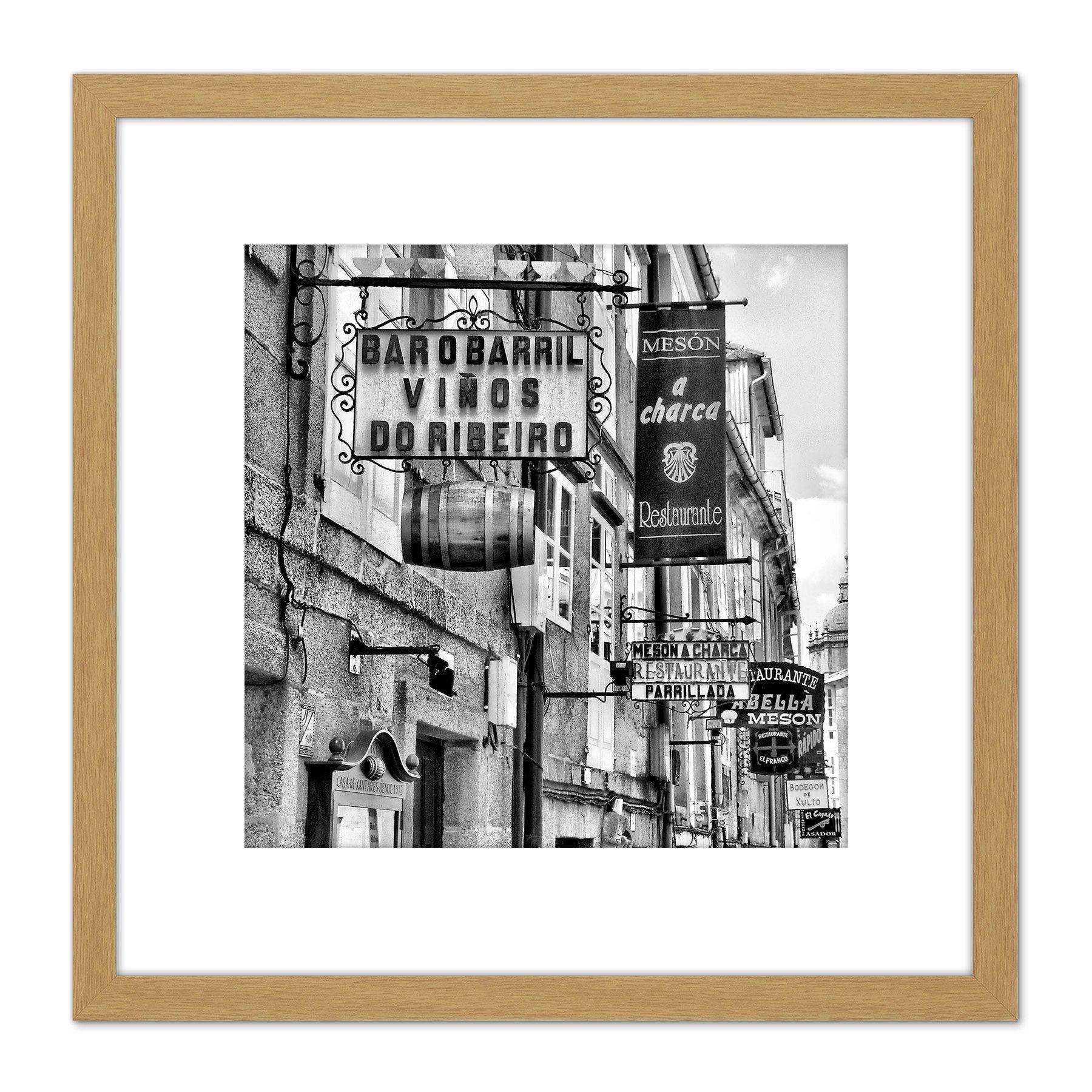 Spanish Street Bars Restuarants Black White Photo 8X8 Inch Square Wooden Framed Wall Art Print Picture with Mount
