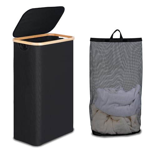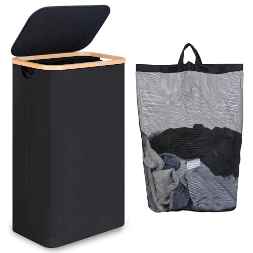 iEGrow Laundry Basket, 60L Tall Washing Basket with Lid and Handle, Slim Foldable Laundry Hamper with Removable and Washable Inner Bag, Narrow Laundry Baskets for Bedroom Bathroom Laundry room (Black)