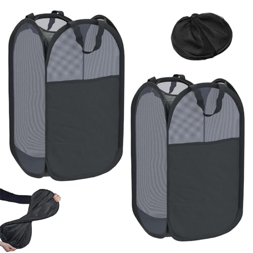 SYVOFOX 2 Pack Mesh Collapsible Laundry Baskets, Pop up Laundry Hamper Bins,Folding Washing Basket with Handles for Clothes Tidy Storage-Black