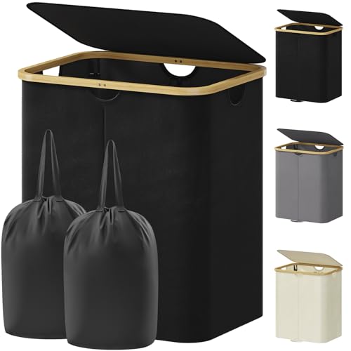 Lifewit 160L Laundry Basket with Lid, 2 Compartments Washing Basket with 2 Removable Liners & Bamboo Frame, Dirty Clothes Bin for Laundry Room Bedroom, Black