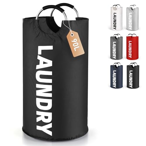 Caroeas 90L Collapsible Laundry Basket, Waterproof Laundry Bag (8 Colors) for Baby, Large Washing Basket with Padded Handles Stands Up Well for Easy Storage, Black