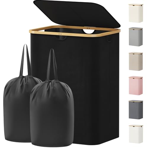 Lifewit 150L Laundry Basket with Lid, Double Dirty Clothes Bin with Bamboo Handles and 2 Removable Bags, Large Foldable Washing Basket for Bedroom, Bathroom, Dorm, Laundry Room, Black