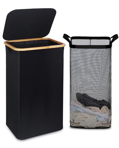 YOUDENOVA Laundry Basket with Lid 85-Litre Large Washing Baskets for Laundry with Laundry Bag Collapsible Laundry Baskets with Handles Laundry Hamper Bamboo Laundry Bin for Bedroom, Bathroom, Black