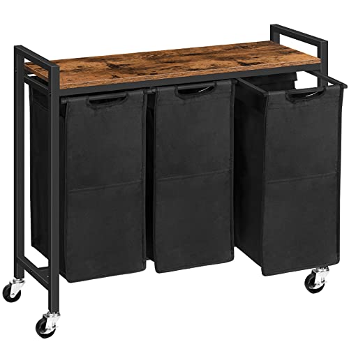 HOOBRO Laundry Basket 3 Compartments, Laundry Sorter 3 × 40 L, Laundry Hamper with Lid, Laundry Trolley on Wheels, Washing Baskets for Bathroom, Bedroom, Rustic Brown and Black EBF38XY01G1