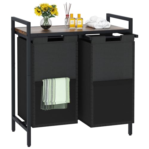 Laundry Basket, 2 Compartments,Dirty Laundry Basket,Laundry Hamper Bins 2 Sections,Black Double Laundry Washing Basket Organiser with 2 Removable Oxford Cloth Bags, Metal Frame