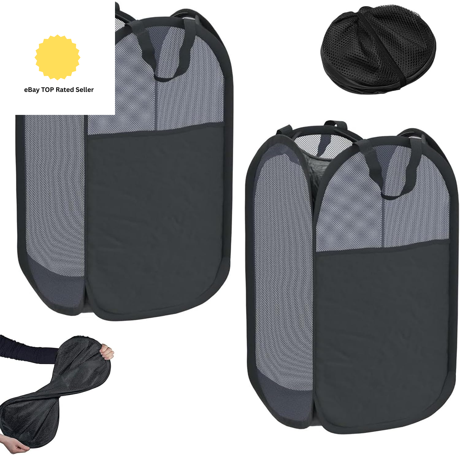 2PCS Black Collapsible Washing Basket, Mesh Folding Laundry Basket, 75L Large W
