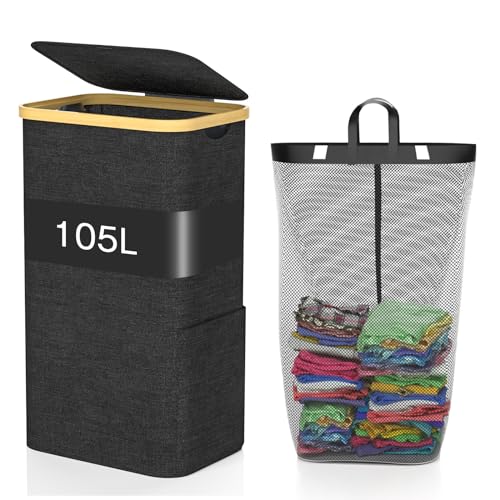 iEGrow 110L laundry Basket with Lid, Large laundry Hamper with Removable and Washable Inner Bag, Tall Washing Baskets for Laundry with Bamboo Handles (Black)