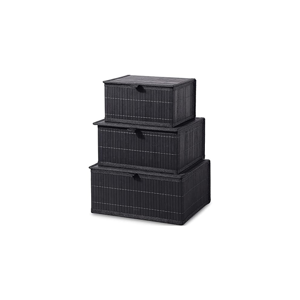 Honygebia Bamboo Decorative Storage Boxes - Set of 3 Woven Lined Storage Basket with Lids Black Wicker Lidded Baskets for Home Kitchen Shelf Org