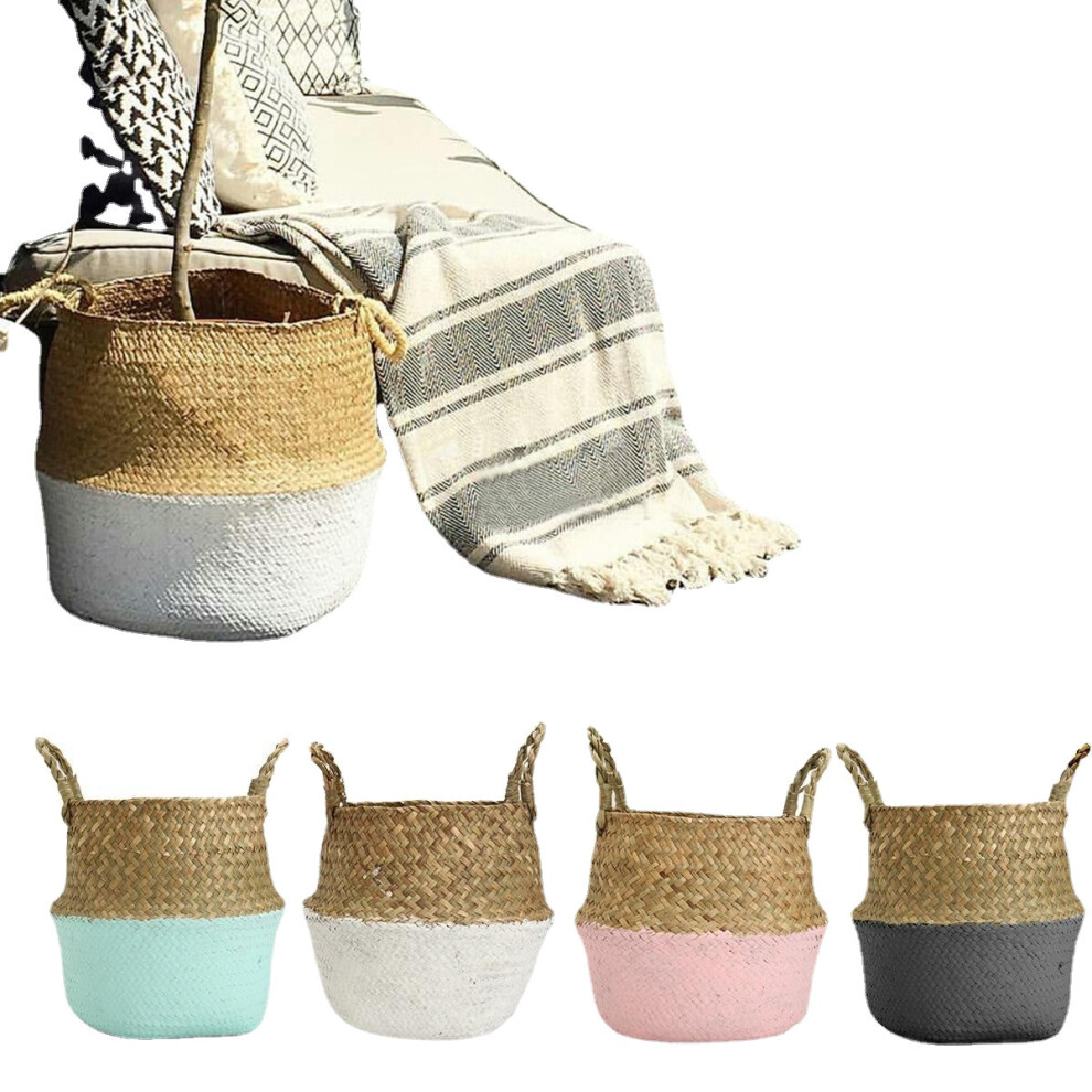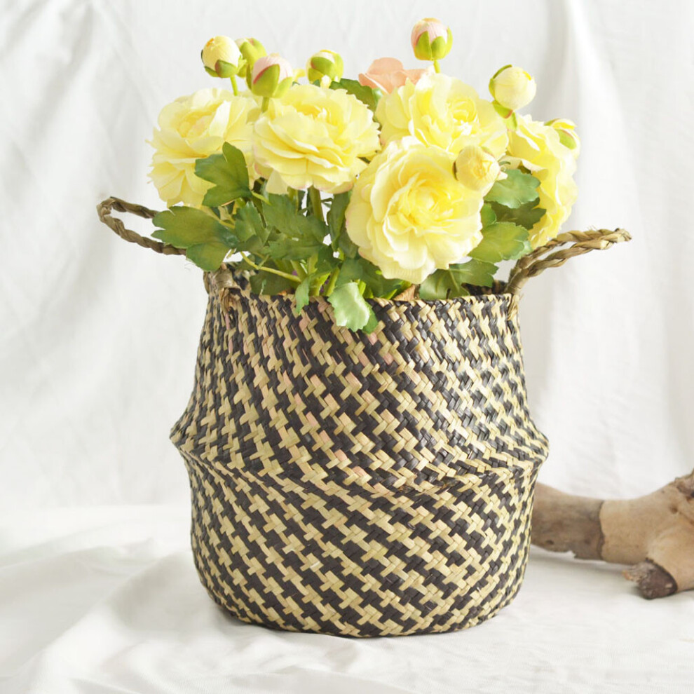 (Black) Foldable Rattan Straw Basket Flower Pot Hanging Wicker Storage Baskets Garden Accessories