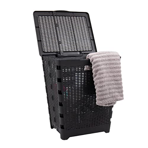 Mind Reader 61L Foldable Laundry Hamper, Clothes Basket, Lid, Wicker Design, Plastic, 18"L x 14.5"W x 21.25"H, Black