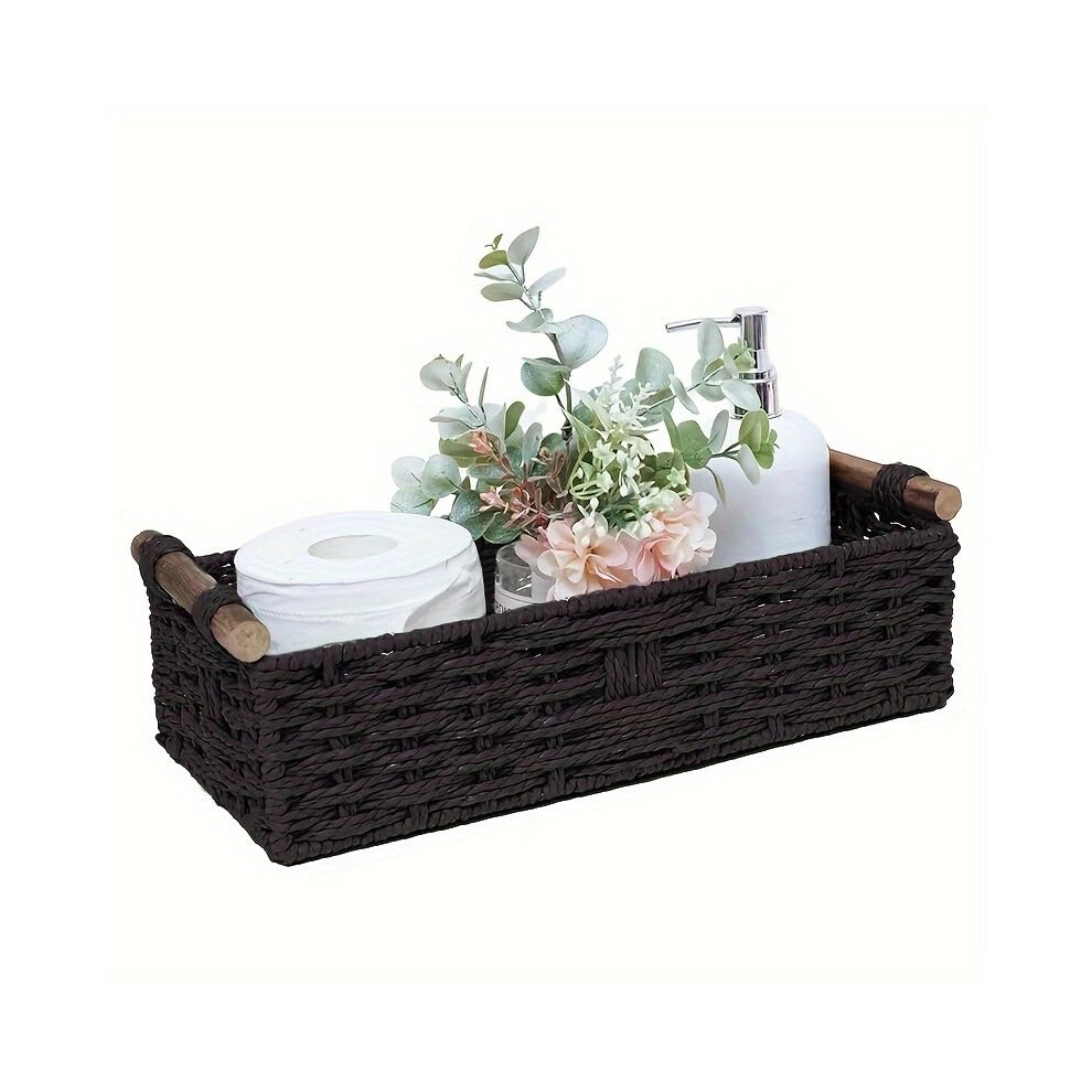 Black Paper Rope Storage Basket with Handle Handwoven Wicker Organizer for Bathroom Toilet Tank Top Countertop & Back of Toilet Decorative Black W